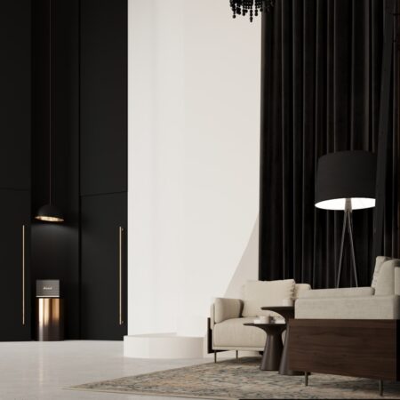 This home showcases a bright, expansive open-plan interior that pairs high-contrast architectural textures with a soft, ethereal material palette. The design is anchored by towering, full-height dark walnut wood paneling that provides a rich, vertical rhythm against the cool, stone-tiled flooring and gallery-white wall planes.