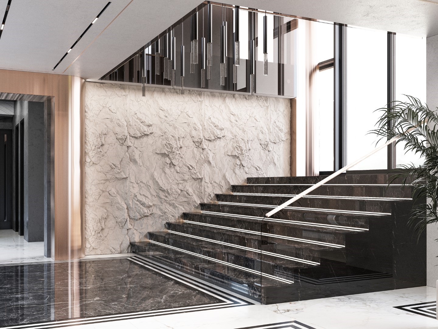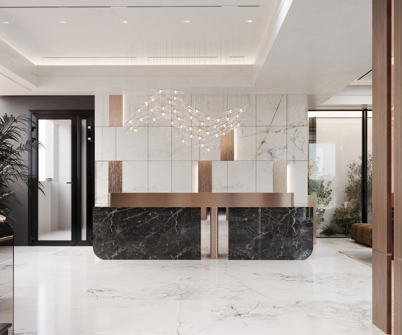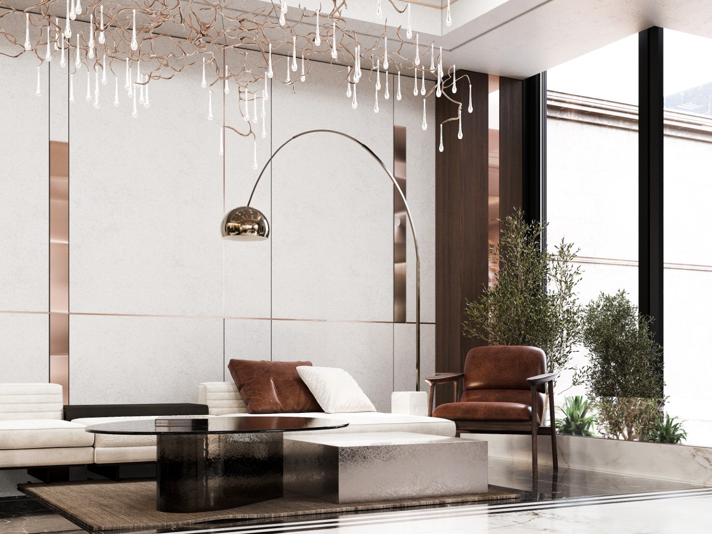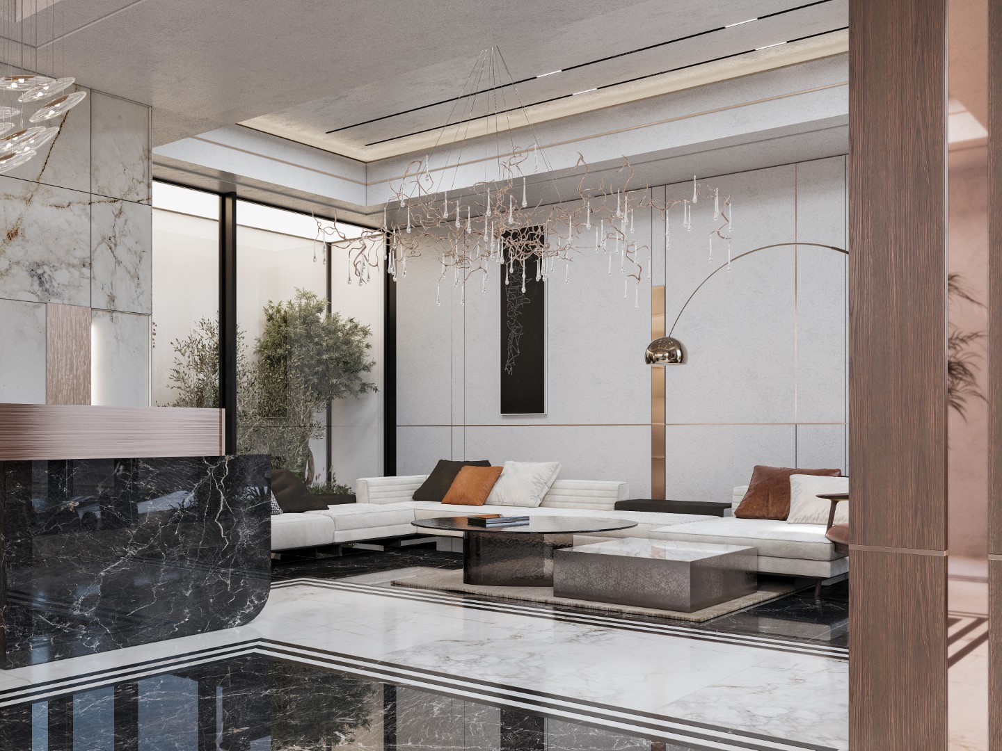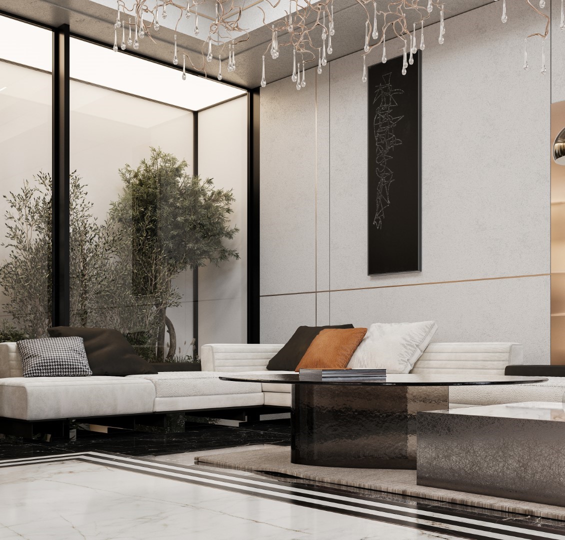 Showcases a luxurious neoclassical living room using ornate wall moldings and polished marble flooring. The design is anchored by rich cognac leather sofas and a grand crystal chandelier, creating a high-end, timelessly elegant vibe