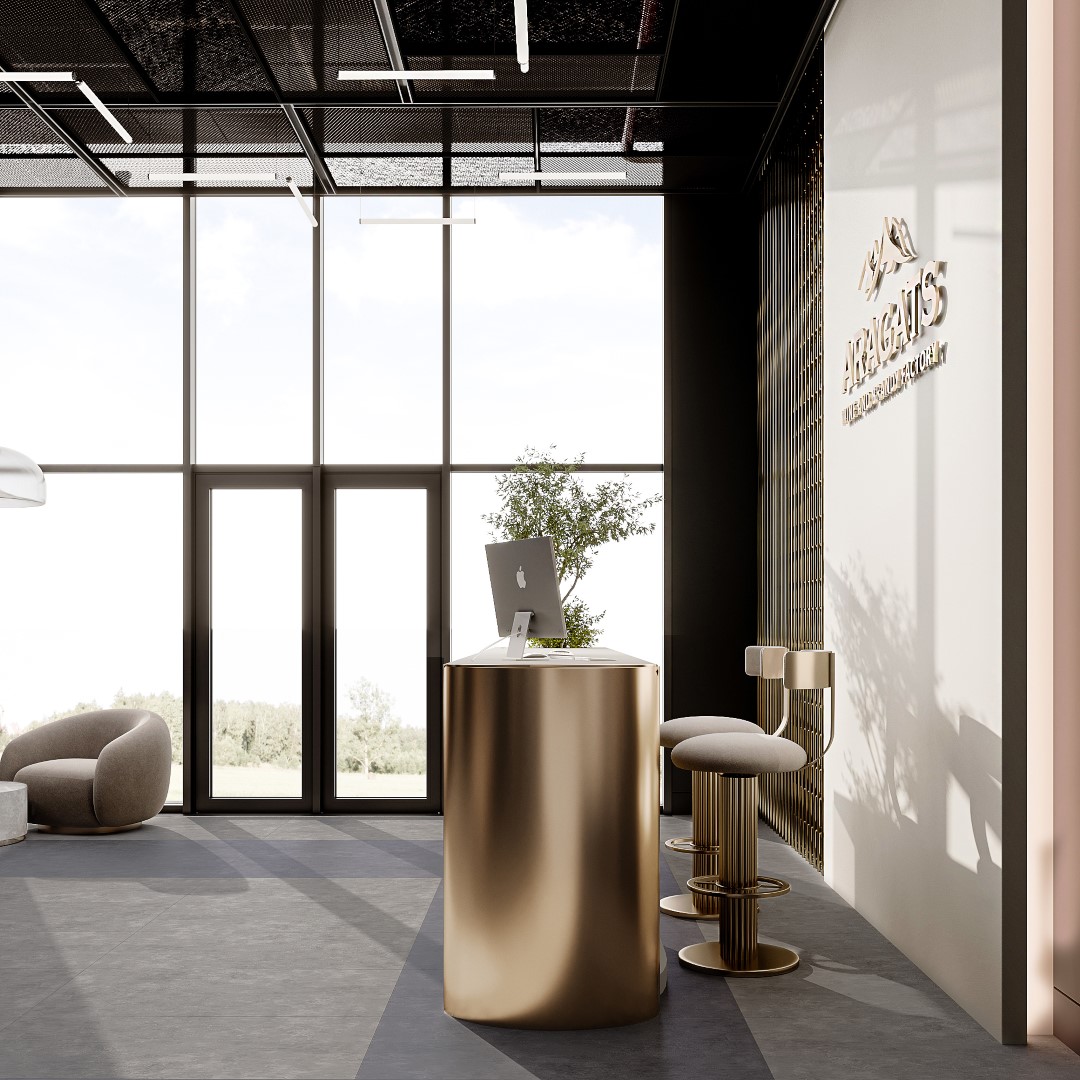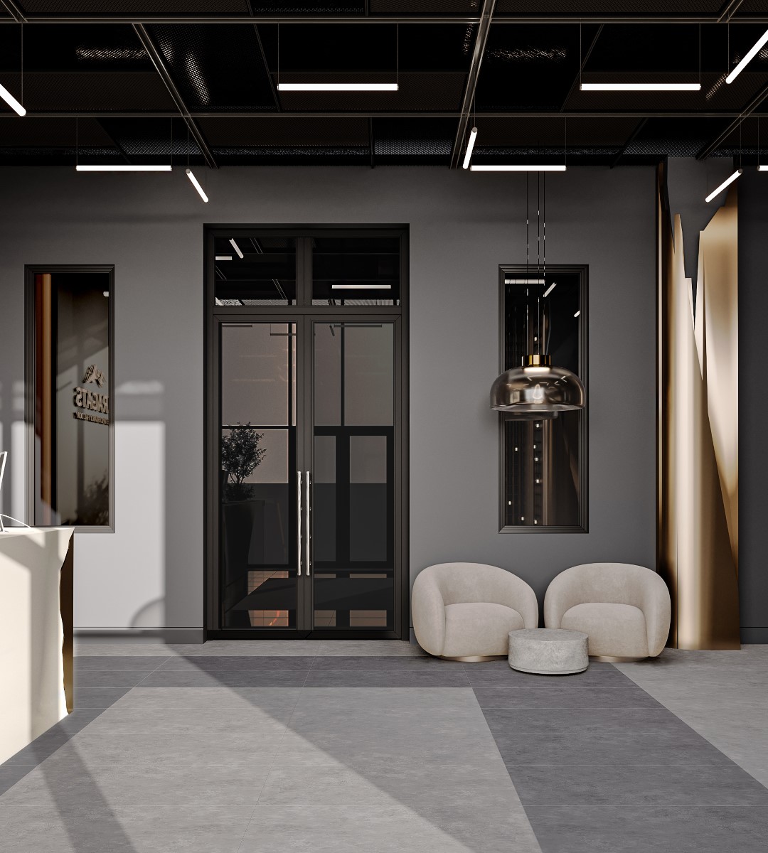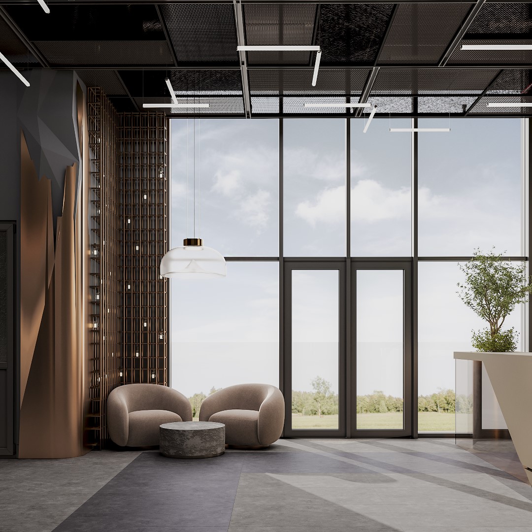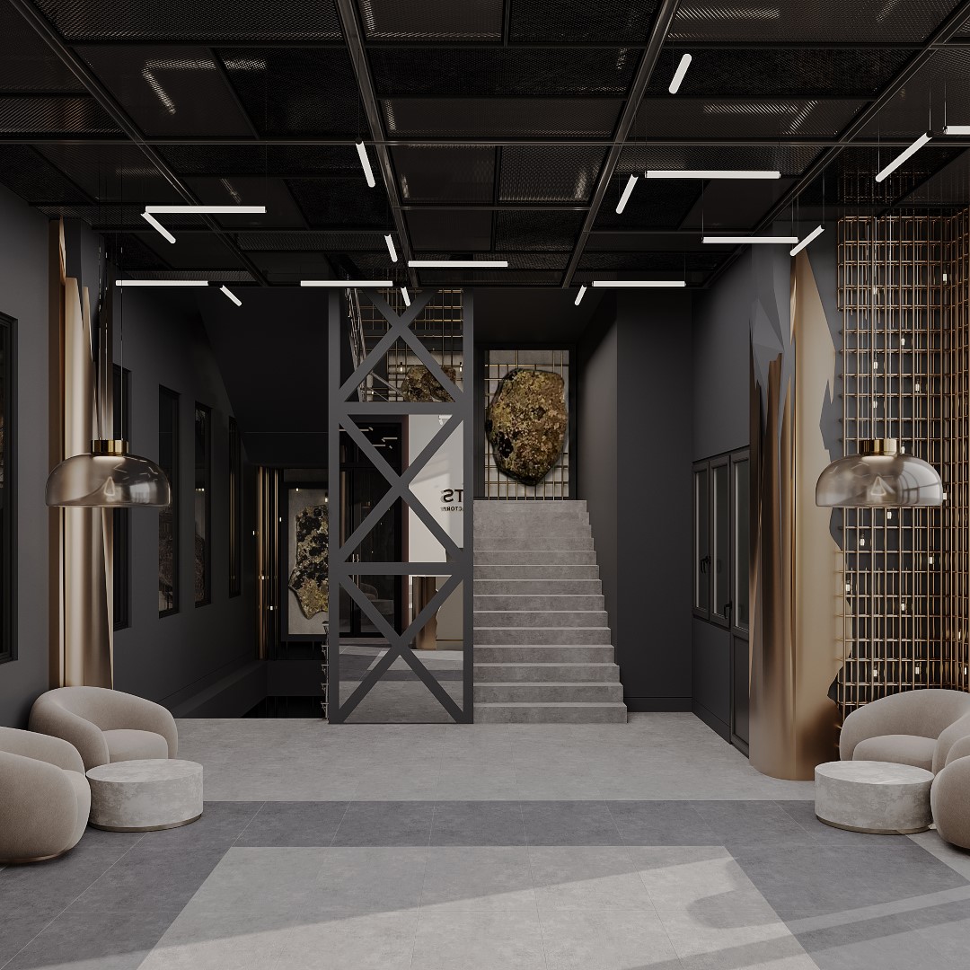 Features an industrial-chic aesthetic with a geometric, angular desk that uses a “natural-edge” detail to mimic raw stone. The space is defined by a dark metal grid wall and exposed ceiling pipes, balanced by warm, linear LED lighting and minimalist branding
